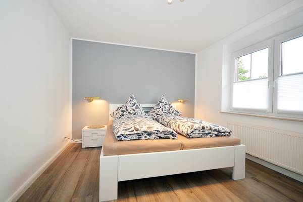 Schlafzimmer 1 mit Doppelbett und Premium-Matratzen sorgt für erholsamen Schlaf. Es gibt viel Platz im großen Kleiderschrank.