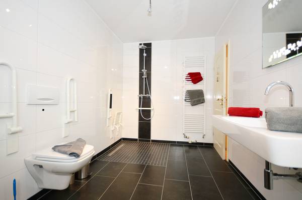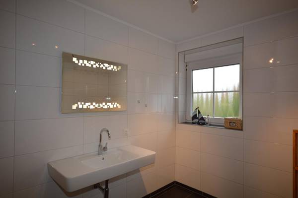 Das übergroße Bad ist modern eingerichtet. Es bietet außergewöhnlich viel Platz und besitzt eine ebenerdige Dusche von 1,20m x 1,20m Größe. Mit vielen verschiedenen Ablagemöglichkeiten ist für höchsten Komfort gesorgt.
