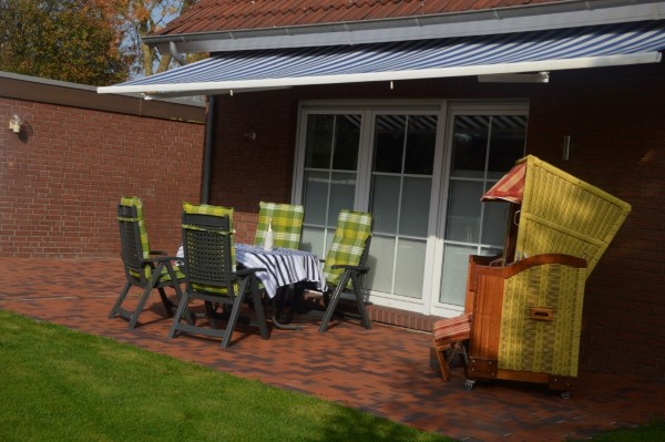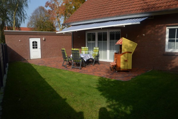 Ein Garten mit großer Terrasse , Rasen und hohem Sichtschutz-Zaun lädt zum Entspannen ein. Ein Gartentisch mit 4 bequemen Stühlen und ein exklusiver Nordsee-Strandkorb wecken Urlaubsgefühle.