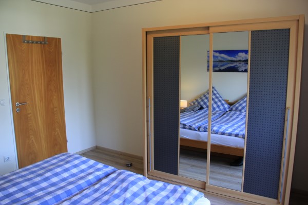 Das geräumige Schlafzimmer, bestehend aus einem Doppelbett mit Premium-Matratzen und einem zeitgemäßen Kleiderschrank mit Schiebetüren lässt sie erholsam schlafen.Ein Kofferbock aus Edelstahl dient als Ablage für ihren Urlaubskoffer.
